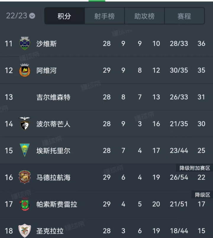 本賽季,圣克拉拉3勝6平19負積15分,排名葡超墊底,距離第16名馬德拉航海7分,已經接近降級。