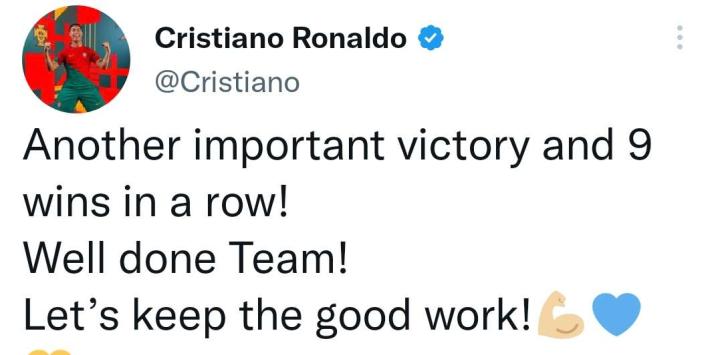 總裁發文慶祝球隊取得 9 連勝C羅在本場比賽打進了一個點球,總裁幫助球隊 2-1 戰勝對手??