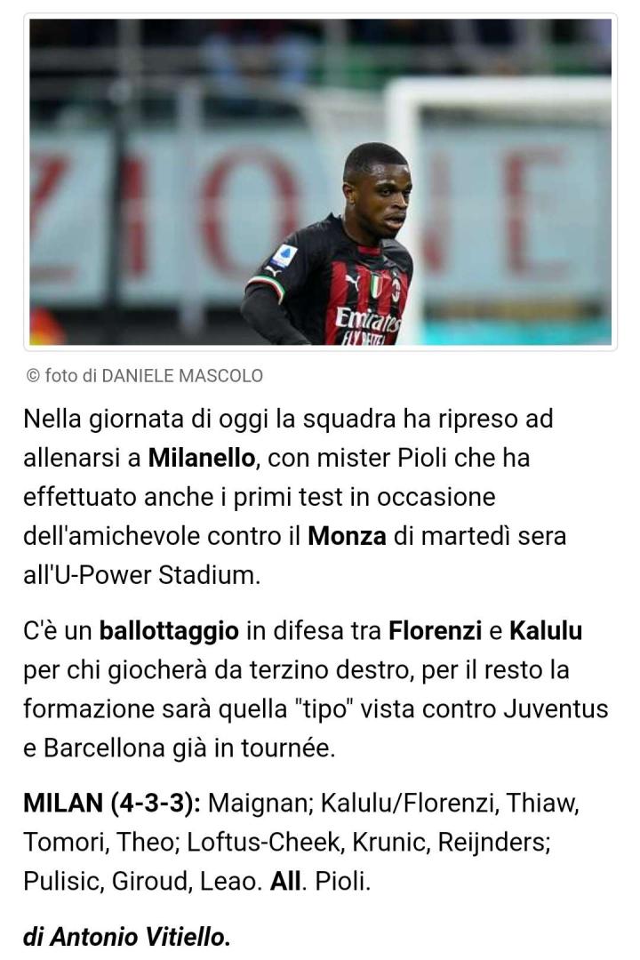 維蒂耶洛預測米蘭對陣蒙扎首發陣容:卡盧盧和弗洛倫齊競爭右后衛4-3-3門將:邁尼昂后衛:卡盧盧/弗洛倫齊、維蒂佳夫、耶洛預測托莫里、米蘭蒙扎特奧中場:奇克、對陣克魯尼奇、陣容賴因德斯前鋒:普利希奇、卡盧吉魯、盧和倫萊奧