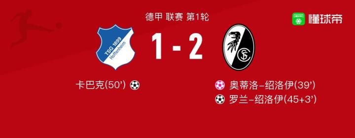 北京時間8月19日德甲 聯賽 第1輪,弗賴堡霍芬海姆主場對陣弗賴堡。弗賴堡霍芬海姆卡巴克破門,弗賴堡奧蒂洛-紹洛伊自擺烏龍。弗賴堡。弗賴堡弗賴堡羅蘭-紹洛伊破門。弗賴堡最終比分1-2。弗賴堡