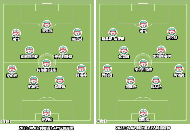 在過去的五場熱身賽中,利物浦的防線配置比較穩定,克洛普嘗試了各種鋒線組合,為索博斯洛伊和麥卡利斯特尋找搭檔。在繼續堅持433陣型的前提下,薩拉赫、加克波、若塔、索博斯洛伊和麥卡利斯特的主力位置比較穩固,中前場的變數其實只有一個——如果加克波出現在中場,薩拉赫和若塔的搭檔將在努涅斯和路易斯-迪亞斯之間產生。