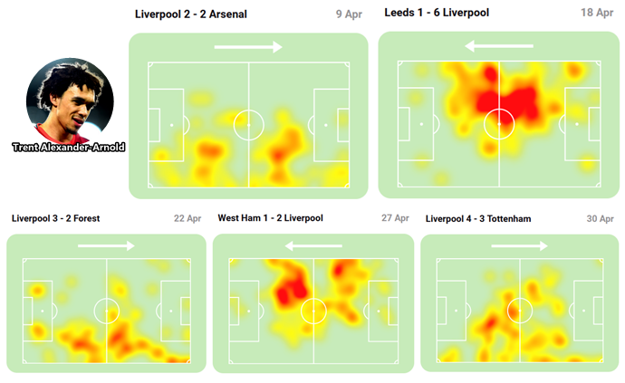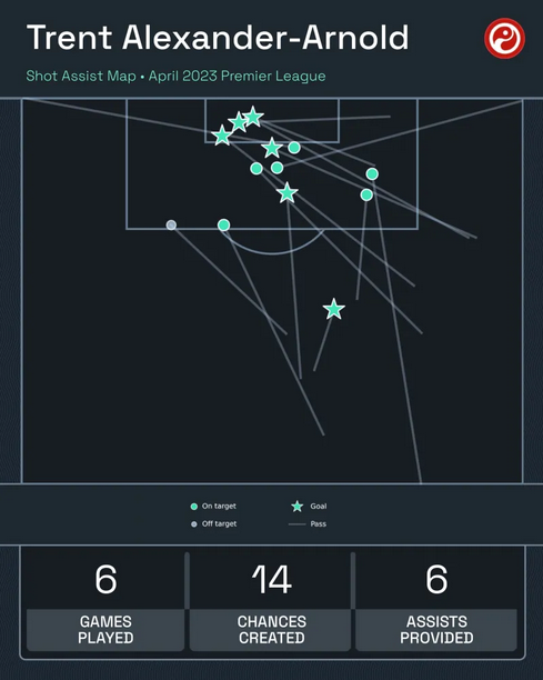 (圖)2023年四月,阿諾德的單月總助攻數達6次,在英超歷史單一自然月助攻排行榜上,與亨利、達倫-安德頓并列排在第二名,利物浦依靠“瘋狂四月”的發揮險些奪得歐冠資格。