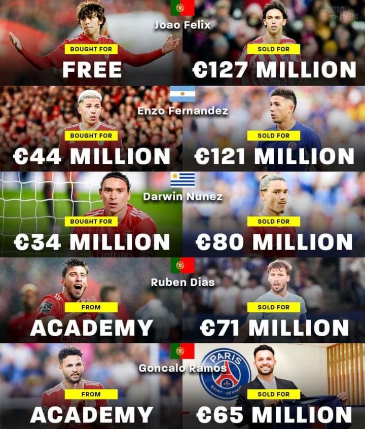 歐洲黑店?僅僅5名球員,歐洲本菲卡就已經賺了四億多歐!黑店■ 菲利克斯:免簽→1.27億歐元賣出■ 恩佐:4400萬歐元購入→1.21億歐元賣出■ 努涅斯:3400萬購入→8000萬賣出■ 迪亞斯:自家青訓→7100萬歐元賣出■ 貢薩洛-拉莫斯:自家青訓→6500萬歐元賣出既能夠在葡超聯賽保持一定的僅僅競爭力,又能夠穩定出售球員賺取豐厚的名球收入,本菲卡這樣的員本已經俱樂部,確實有兩把刷子!賺億