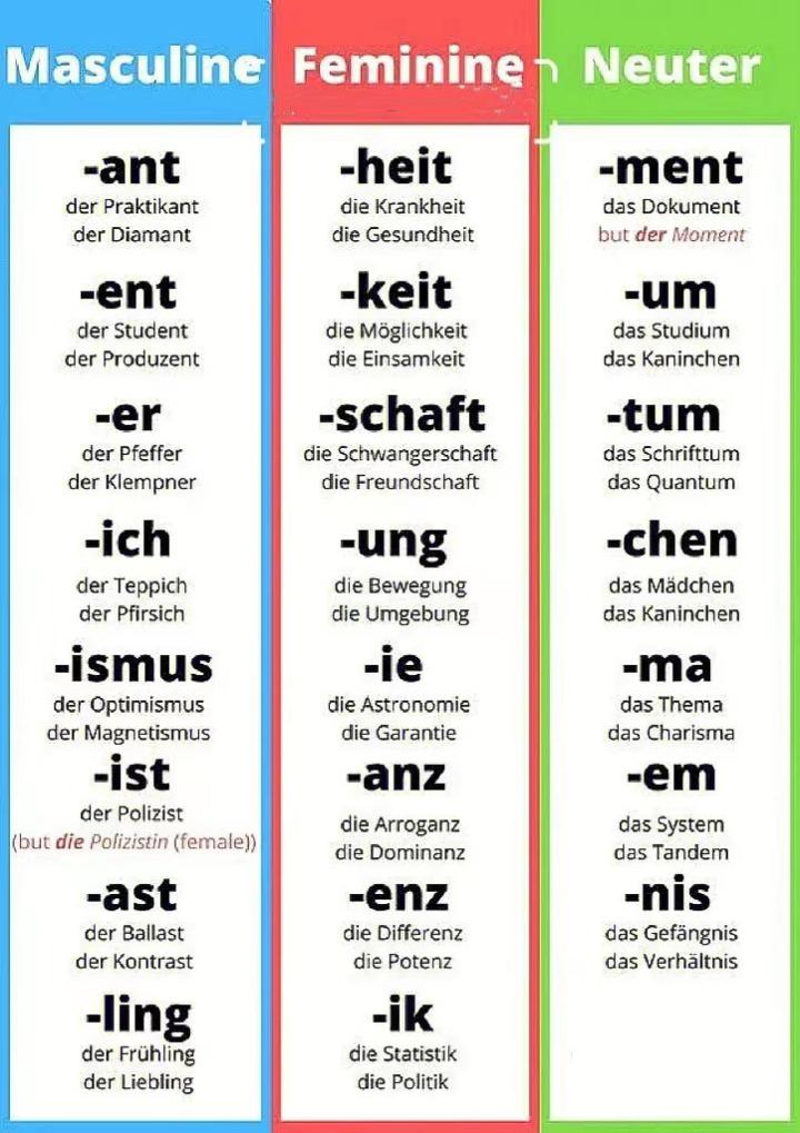 (德語名詞詞性的詞尾分類,從左至右分別是陽性、陰性、中性)