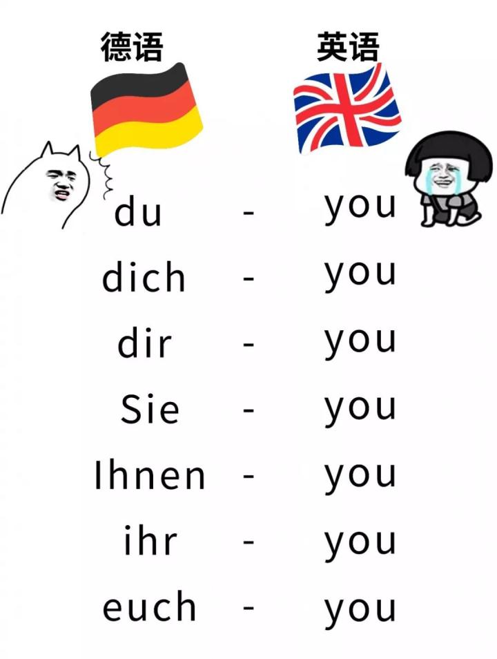 (德語還存在格的變化,上圖為第二人稱代詞的格變化)
