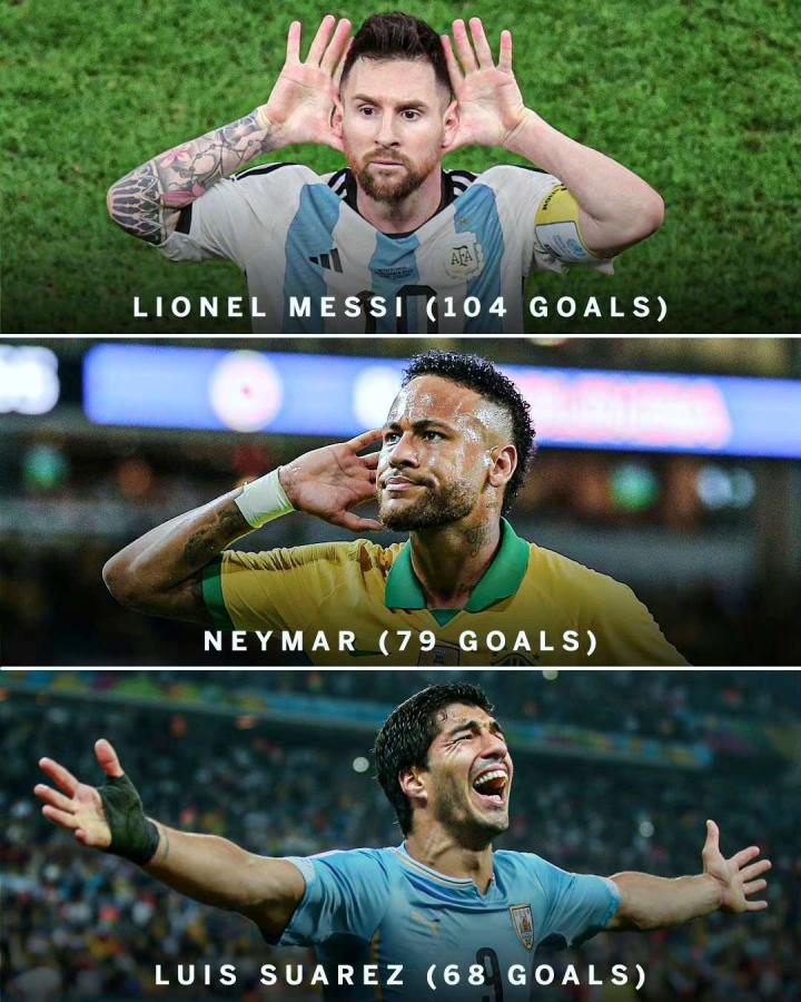 隊史射手王!梅西:104球(阿根廷)內馬爾:79球(巴西)蘇亞雷斯:68球(烏拉圭)