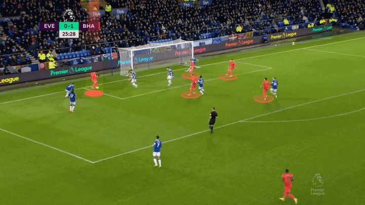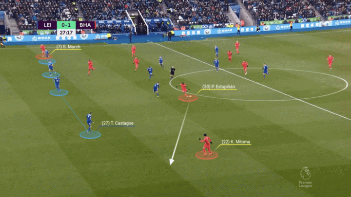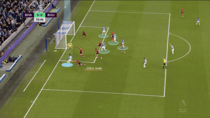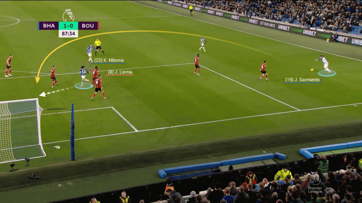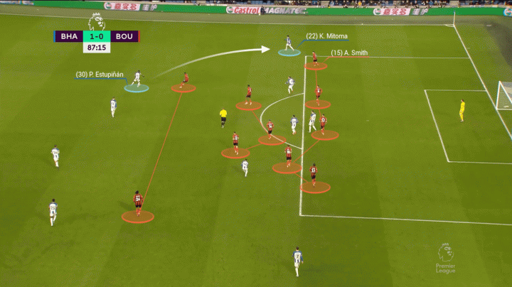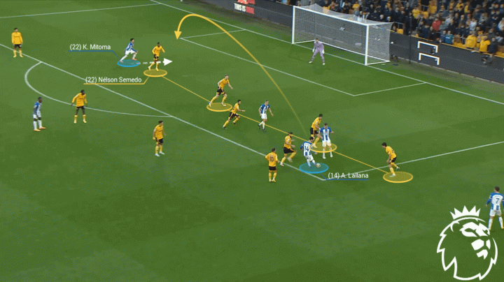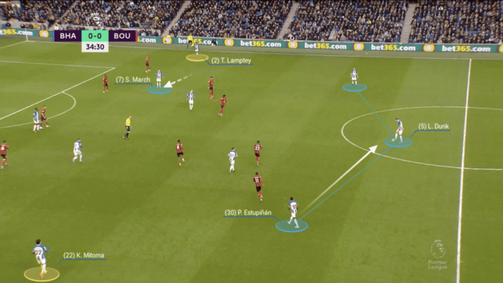 有時,左后衛埃斯圖皮尼安會在一個臨時的三后衛體系中內收靠近中路,比如主場對陣伯恩茅斯的比賽,三笘薰和蘭普泰(黃色圓圈)會保證本隊有足夠的進攻寬度。