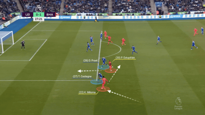在三笘薰內切的過程中,埃斯圖皮尼安向底線方向跑動帶走了普拉埃特,給三笘薰創造了起腳的空間。