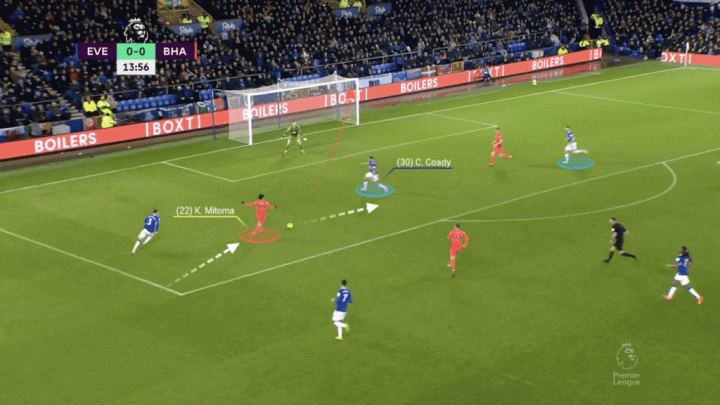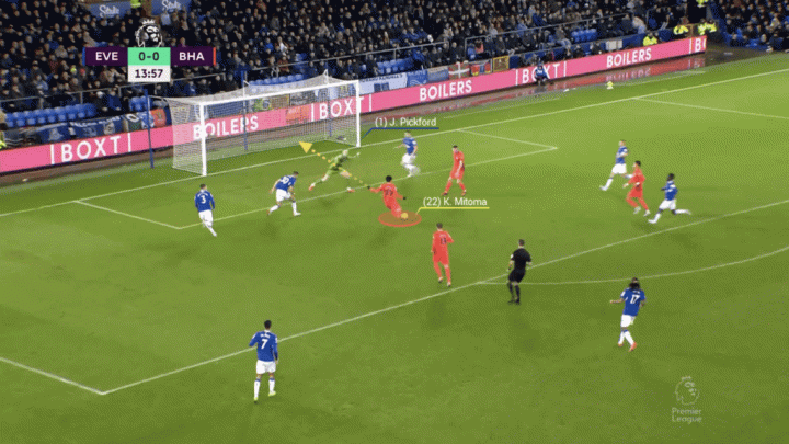 在對陣埃弗頓的比賽中,三笘薰再次祭出強突底線后倒三角傳球的絕技,他擺脫了伊沃比和帕特森的雙人防守,但突破到底線后沒能找到跟進的隊友。