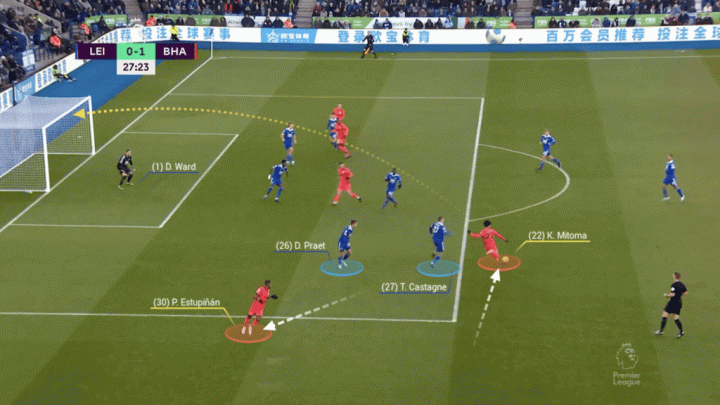 布萊頓將球從右路轉移到左路,位于中路的埃斯圖皮尼安發現三笘薰與對方邊后衛卡斯塔涅形成了一對一態勢。