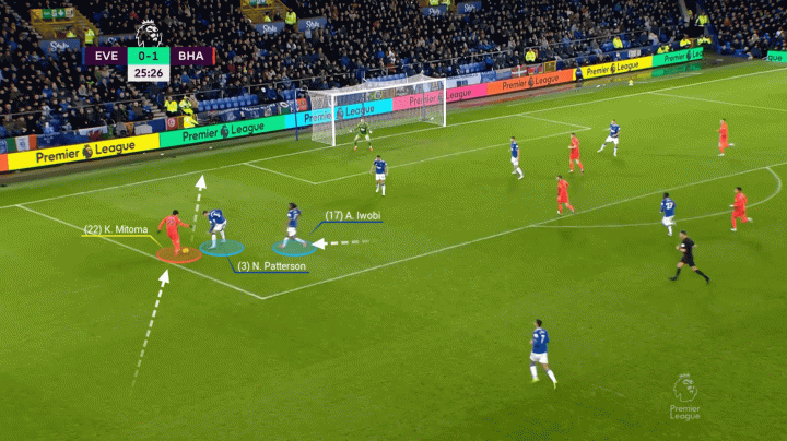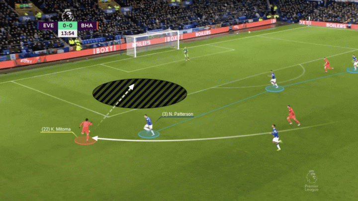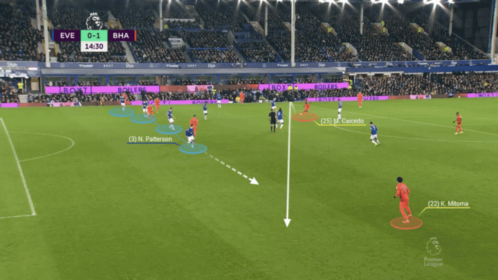 比如布萊頓客場對陣埃弗頓的比賽里三笘薰開場不久的進球。凱塞多發現左邊路的三笘薰空了,試圖用一腳精準的長傳尋找后者,主隊右邊后衛帕特森緊急上前攔截。