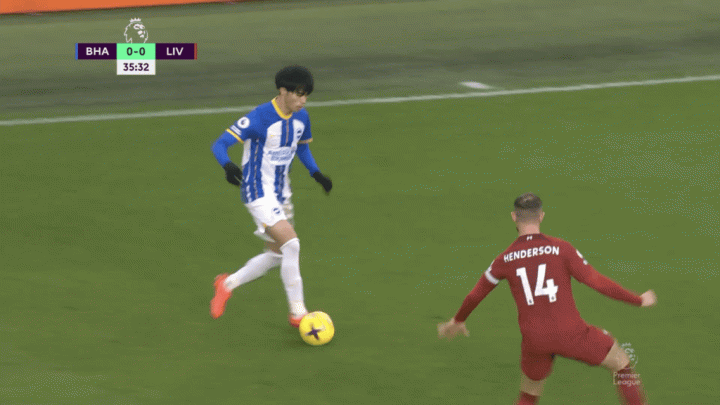 三笘薰接到埃斯圖皮尼安的傳球,但對方回收得很深,三笘薰沒有突破的空間。