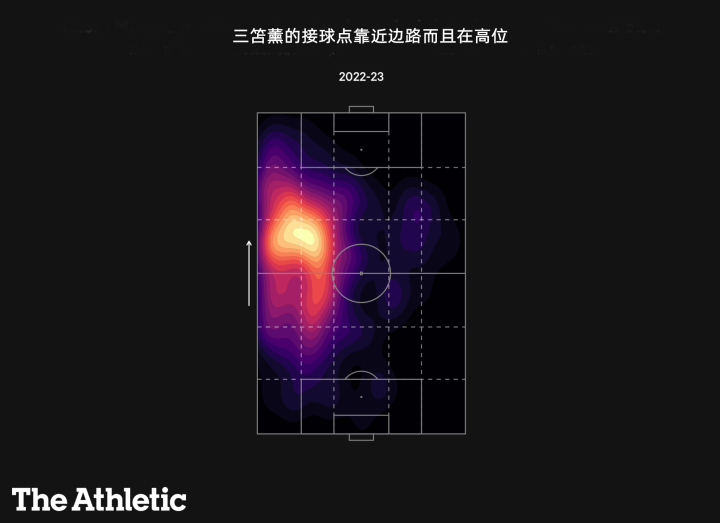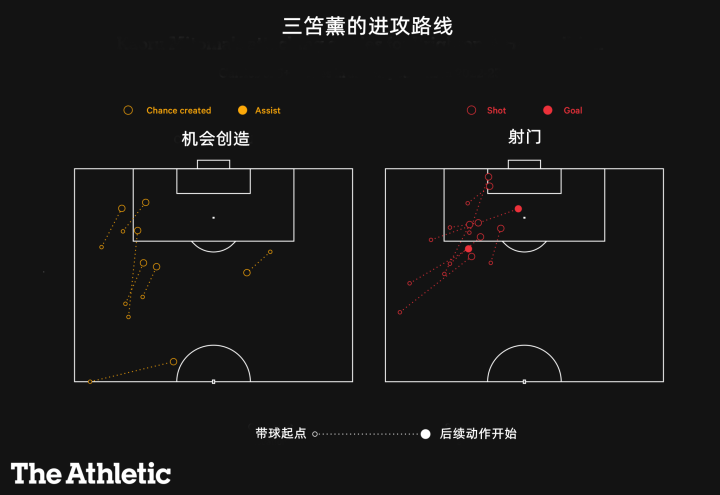 下圖顯示了三笘薰利用盤帶或傳或射的概況??纯此谋P帶,距離都比較長,他14次在禁區內一對一是英超第三高,三笘薰的高速盤帶是布萊頓反擊的一把利器。