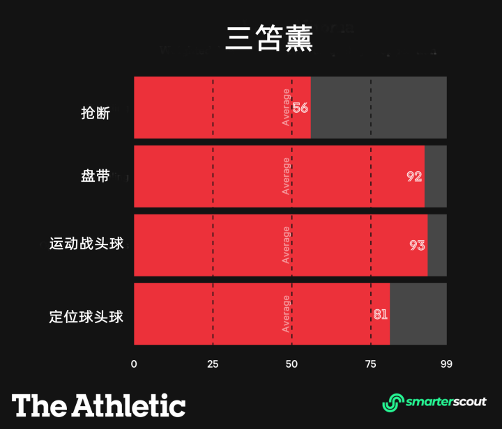 如果利用Smarterscout的數據進行分析,在根據對手實力進行相應調整后,三笘薰在運動戰中的頭球能力達到了93分(93/99),與他的強項盤帶(92/99)不相上下。