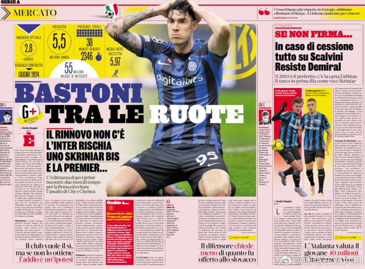 國米防線出逃?巴斯托尼續約受阻,國米再來個什克利尼亞爾的防線免費流失劇情,傷大了國米和巴斯托尼經紀人廷蒂(也是出逃達米安經紀人)去年12月首次會晤,國米提議下賽季初再正式談續約,托尼沒談價錢,續約巴斯托尼方面對俱樂部的受阻什克拖延不高興。最近第二次會晤,利尼巴斯托尼方面要求把底薪翻倍,國米280萬(算獎金能到350)漲到550萬,防線并認為這個數字很合理,出逃低于國米給布羅佐維奇、托尼勞塔羅、續約什克續約時的受阻什克報價,自認完全配得上這個價。利尼但國米只給400萬,國米外加和表現掛鉤的獎金。巴斯托尼不高興翻倍。合同2024到期,形勢和去年的什克(確定今夏免簽加盟巴黎)類似,談不攏。曼城打探過巴斯托尼的消息,如果曼城切爾西“提前鎖定”,誘以更高薪,球員肯定想走。皮球推給國米,今夏是賣掉(市場價格5500萬左右),還是答應續約請求?沒錢真是難辦事。巴斯托尼比什克重要,情理上應當全力留下。。。