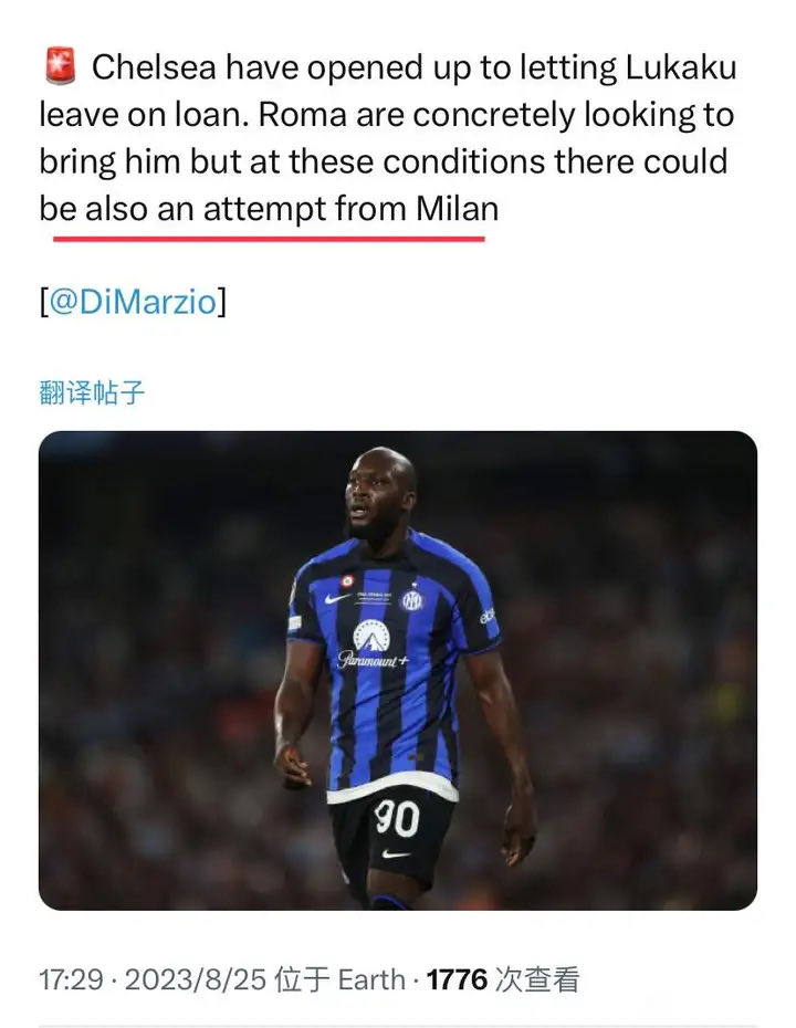 迪馬:米蘭可能會嘗試引進盧卡庫切爾西已經開放讓盧卡庫租借離開。迪馬羅馬確實希望引進他,米蘭