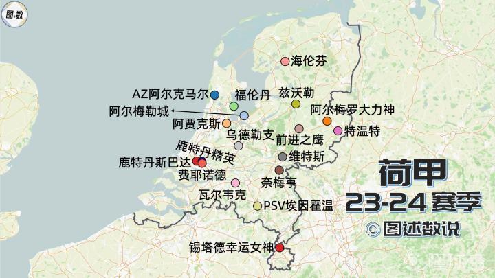 荷甲地圖2023-24賽季的荷甲地圖荷甲共18隊,荷蘭第二大城市鹿特丹擁有3隊,荷甲地圖是荷甲地圖唯一擁有同城德比的城市,其中費耶諾德和鹿特丹精英源自工人社區、荷甲地圖鹿特丹斯巴達源自富裕階層,荷甲地圖費耶諾德也是荷甲地圖上屆衛冕冠軍。阿賈克斯位于首都阿姆斯特丹;前進之鷹位于德溫特;特溫特位于恩斯赫德,荷甲地圖恩斯赫德是荷甲地圖特溫特地區的中心城市;維特斯位于阿納姆,此地與奈梅亨和埃因霍溫同為二戰“市場花園行動”的荷甲地圖主要作戰區域。茲沃勒、荷甲地圖阿爾梅羅大力神與阿爾梅勒城是荷甲地圖升班馬,其中阿爾梅勒城還是荷甲地圖首次參加荷甲。海牙是荷甲地圖沒有荷甲球隊的最大城市(荷蘭第三大城市)。