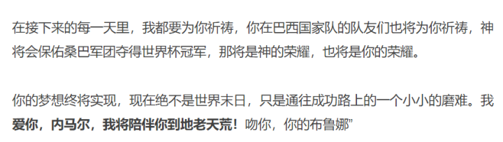 讓外界都感動的是,布魯娜表示,接下來每一天都會為內馬爾祈禱,為巴西隊祈禱,希望他們能拿到世界杯冠軍。在長文的最后,布魯娜深情告白:我愛你,內馬爾,我將陪伴你到地老天荒!吻你,永遠愛你,愛你的布魯娜。