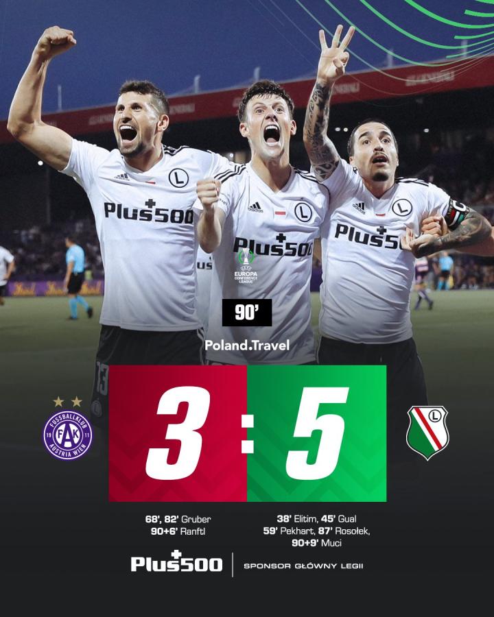 首回合比賽在波蘭華沙舉行,胡斯科維奇在上下半場分別為維也納打進一球,終場前穆奇扳回一球,萊吉亞總比分1-2落后;次回合來到奧地利維也納,萊吉亞反客為主,埃利蒂姆和瓜爾幫助球隊反超總比分,下半場佩克哈特進一步擴大領先優勢,隨后格魯比爾連進兩球扳平總比分。替補登場的羅索韋克在第87分鐘再次幫助萊吉亞領先,尤基奇隨后染紅,維也納少打一人。傷停補時階段,蘭夫特幫助維也納完成絕平,但萊吉亞立即還以顏色,穆奇在讀秒階段打進絕殺進球,萊吉亞最終總比分6-5逆轉晉級,將在附加賽對陣丹麥球隊中日德蘭。