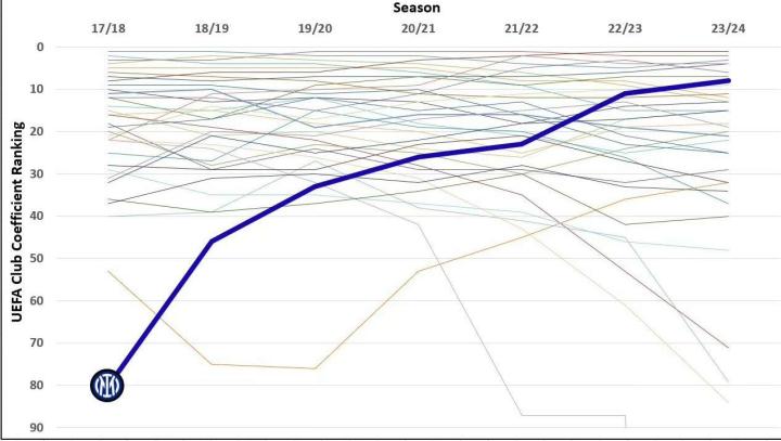 積分排名飛速上升,從17/18賽季的蘇寧收購第80名升至目前的第8名。