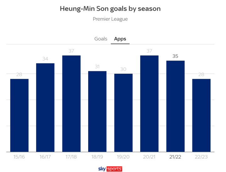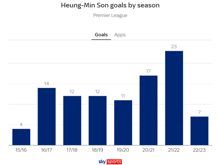 上賽季,球林孫興慜以創造職業生涯新高的暗草23球,與薩拉赫共享英超金靴,驚風將軍并且連續6個賽季進球上雙。然而本賽季,他卻僅有7球入賬。