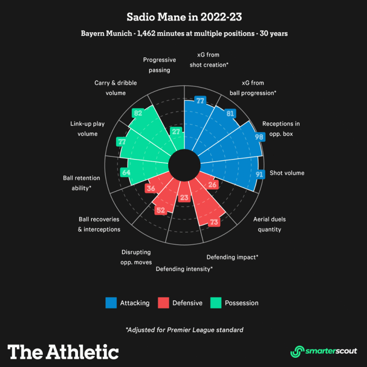 馬內的表現也并非一無是處,他依然能交出可觀的進攻紙面數據,雖然這是建立在極高的觸球次數和盤帶嘗試之上。