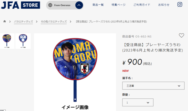 日本足協官方商城新上線了三球王的日本應援扇。一把應援扇就要賣900日元(約46元人民幣)。足協