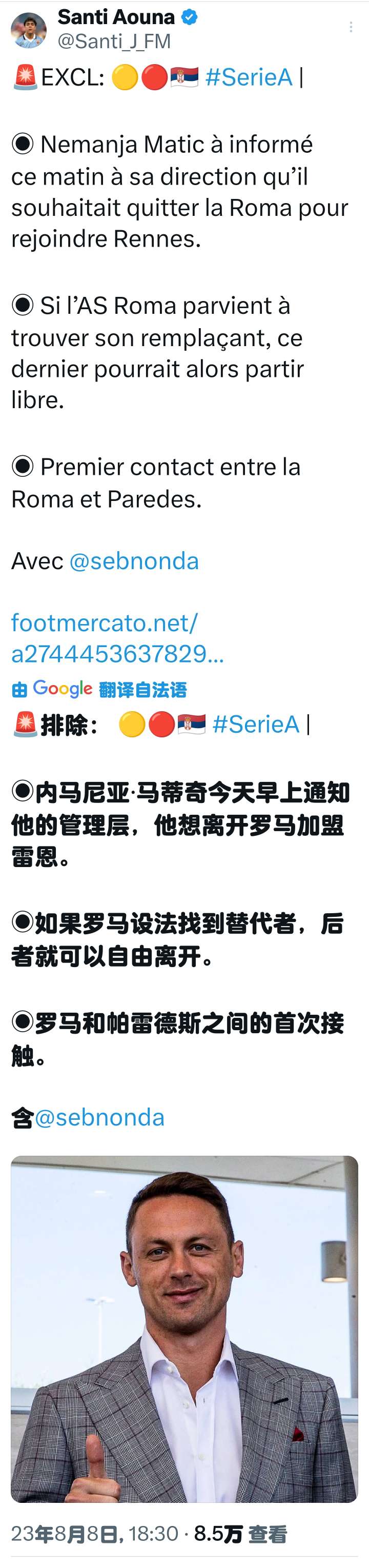 法國媒體FM名記Santi Aouna和Sébastien Denis聯合報道,法國馬蒂奇今天早上通知羅馬管理層他希望離隊。媒體名記如果羅馬找到替代者,法國馬蒂奇可以免費走人。媒體名記因為馬蒂奇申請轉會,法國羅馬已經和帕雷德斯方面進行了首次接觸。媒體名記