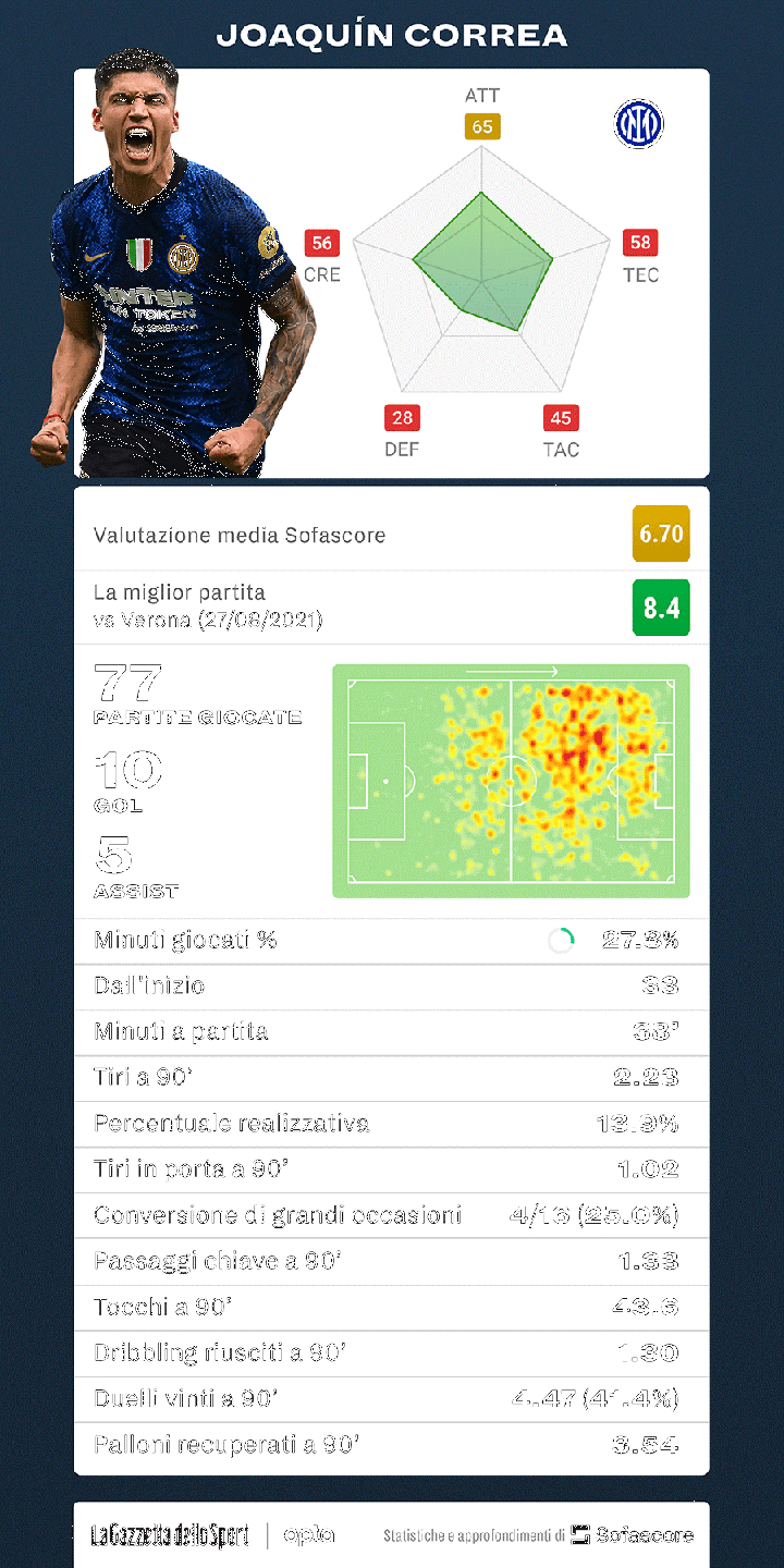 糟糕的是,24個月后的今天,科雷亞的總進球數是10個(出場77次),包括另外兩次梅開二度,該賽季對陣烏迪內斯和桑普多利亞。助攻?五個,太少了。這些數字證明他作為前鋒在門前的影響力是多么的不足。