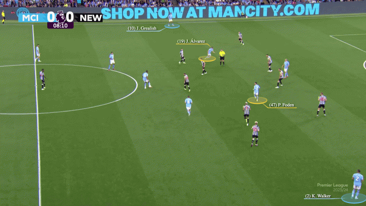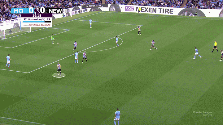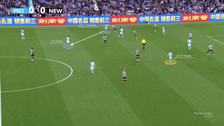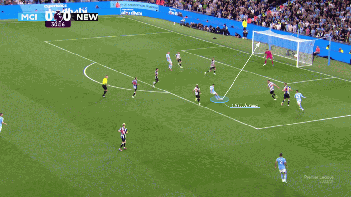 盡管(曼城)創造了很多機會,但阿爾瓦雷斯的進球是本場比賽曼城的唯一進球。但曼城球員們精妙的無球跑動意味著他們也不需要第二個,格拉利什充滿紀律性的回防和策應讓紐卡右邊路的特里皮爾毫無作為。
