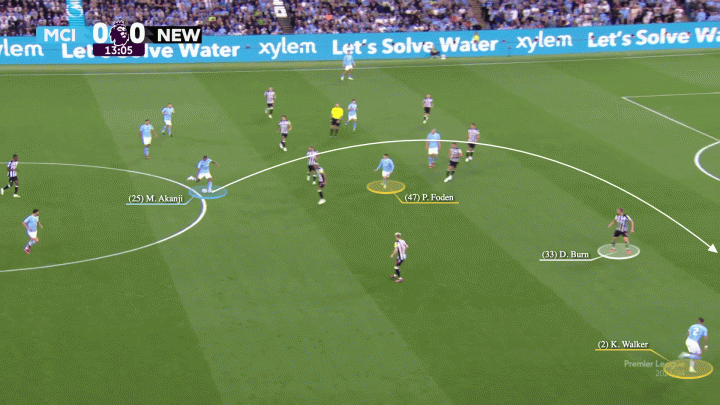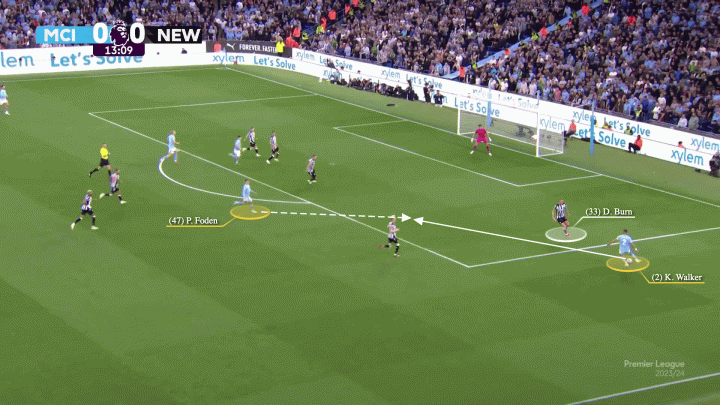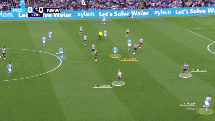 當紐卡變陣4-5-1后,沃克和福登在右邊路總是對紐卡左邊后衛丹-伯恩形成2打1。