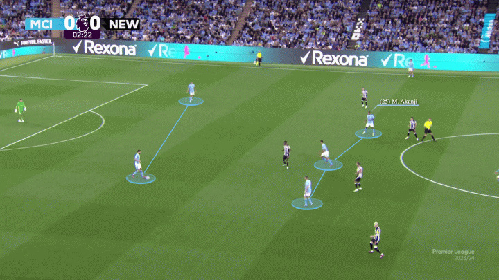 當曼城持球時,阿坎吉從中后衛位置推進到中場,與羅德里、科瓦契奇并肩作戰,這意味著曼城中后場是一個倒梯形的3-2布置,格瓦迪奧爾和魯本-迪亞斯堅守最后一道防線。