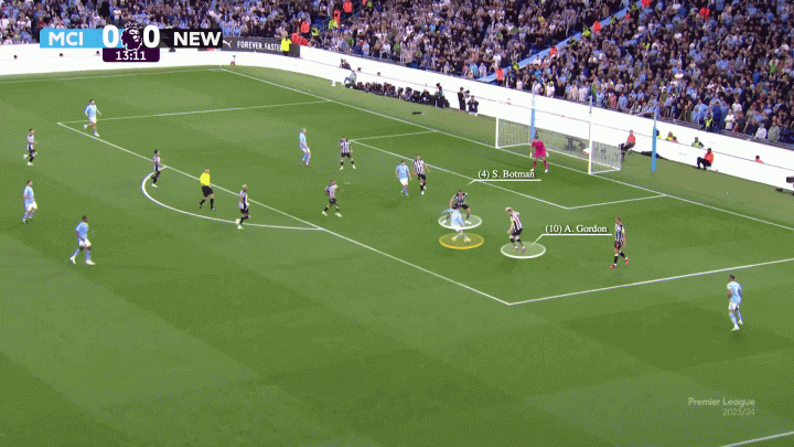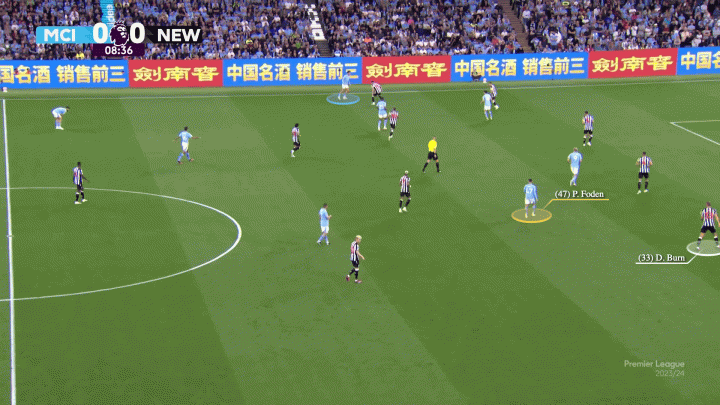 與怠于回防的安東尼-戈登不同,格拉利什在曼城防守時一定會回撤與隊友組成五人防線。再加上曼城的壓迫,紐卡斯爾聯幾乎看不到扳平的希望。