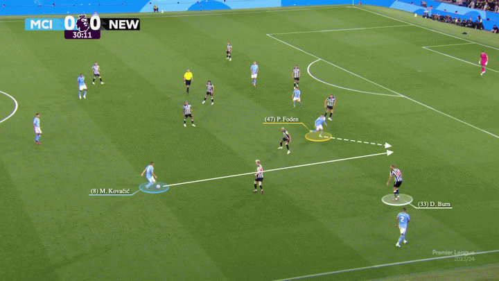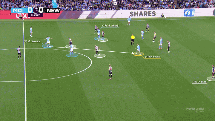 在中場,阿坎吉的前壓使雙方在中場形成了3對3的均勢,如此一來對方的三中場根本無暇顧及身后來回游走的福登。如下圖,科瓦契奇發現了處于兩條線之間的福登,丹-伯恩不敢輕動,因為有沃克牢牢牽制著他。