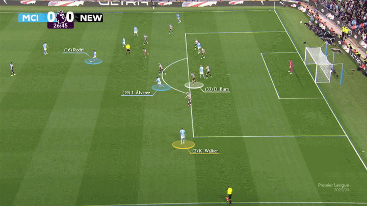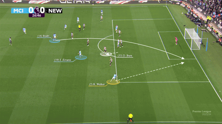 在另一個例子中,丹-伯恩再一次無所適從了——他既不敢上前對福登緊逼,又顧不上在邊路狂飆的沃克,阿坎吉直接找到了前插中的沃克。