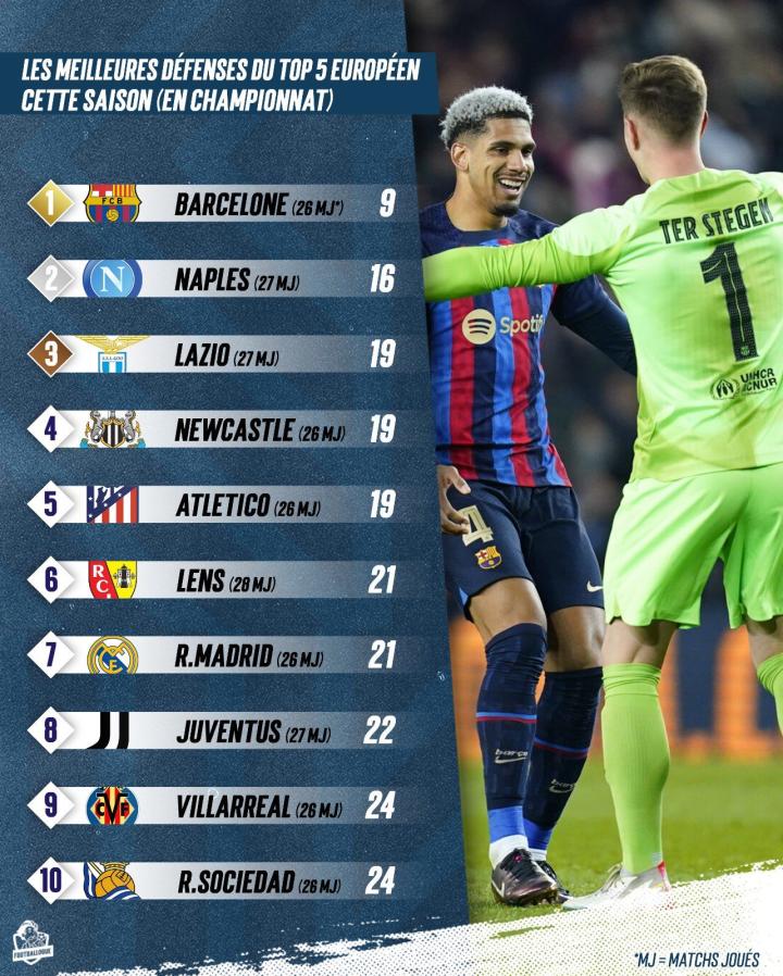 今日图评丨本赛季欧洲五大联赛防守最好的10支球队...