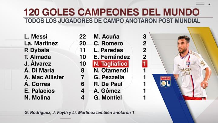 23名非門將球員在奪得世界杯冠軍后均已取得進球,總進球數為120