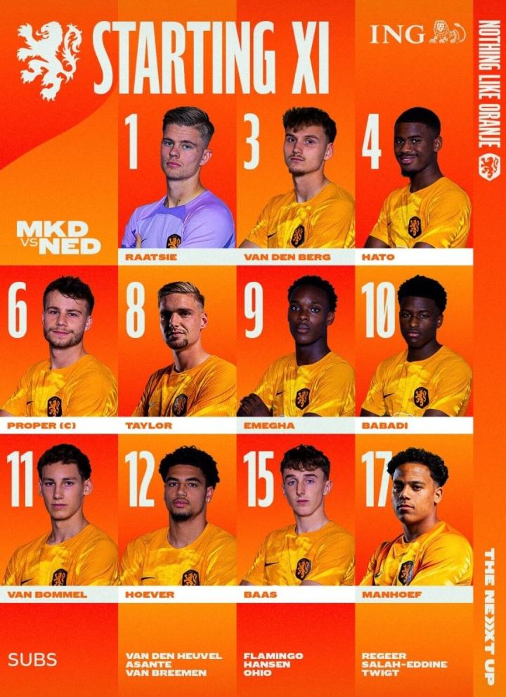 荷蘭U21歐青預選賽VS北馬其頓U21首發陣容:拉特西(烏德勒支)赫維爾(斯托克城)范登貝赫(米德爾斯堡)哈托(阿賈克斯)巴斯(奈梅亨)普羅珀(奈梅亨)泰勒(阿賈克斯)巴巴迪(PSV埃因霍溫)曼霍夫(維特斯)埃梅加(斯特拉斯堡)范博梅爾(阿爾克馬爾)
