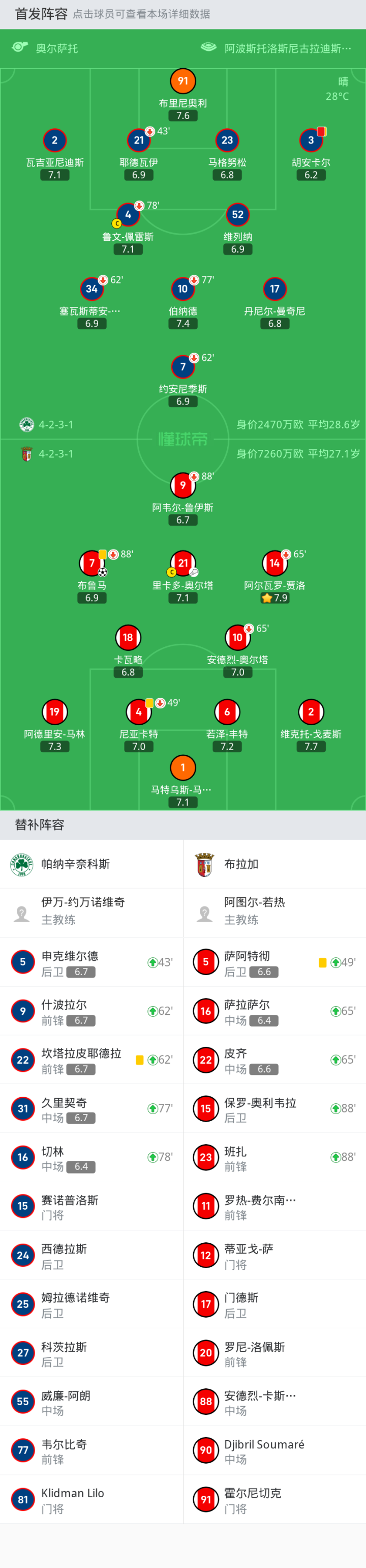 帕納辛奈科斯首發:魯文-佩雷斯, 馬格努松, 胡安卡爾, 布里尼奧利, 維列納, 伯納德, 耶德瓦伊, 塞瓦斯蒂安-帕拉西奧斯, 丹尼爾-曼奇尼, 約安尼季斯, 瓦吉亞尼迪斯