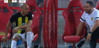 第90+4分鐘,法比尼奧腿上敷上冰袋,坐在替補席交流