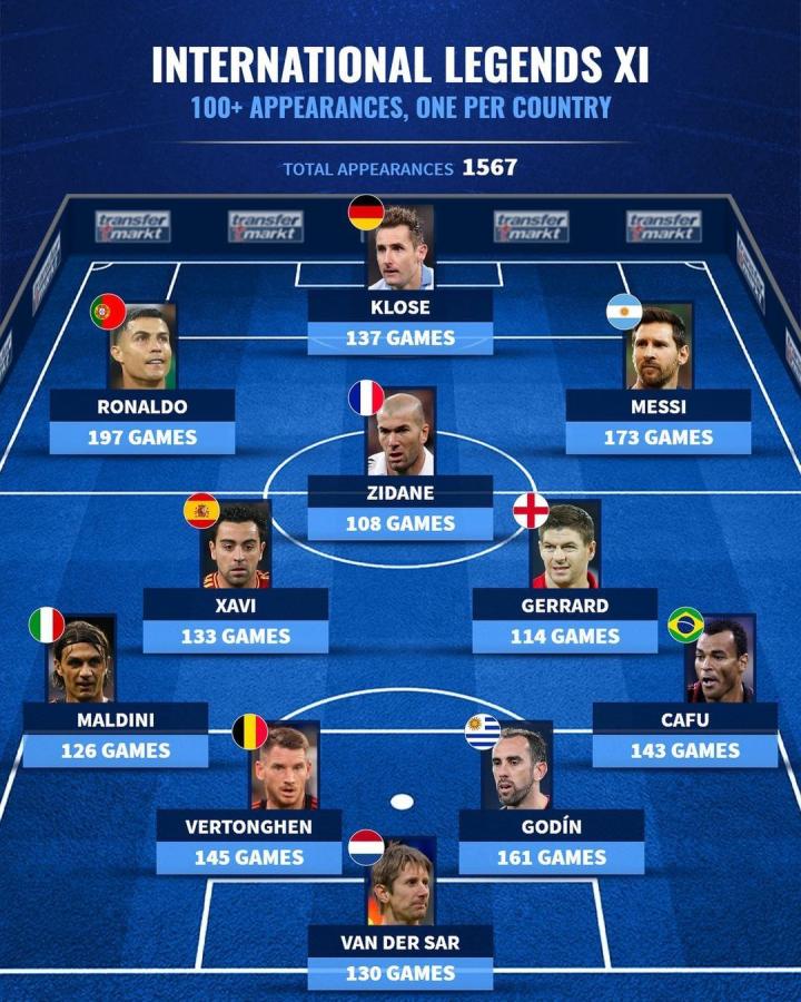 德轉選出代表國家隊出戰超過百場的德轉代表隊出球員組成傳奇11人陣容,是選出