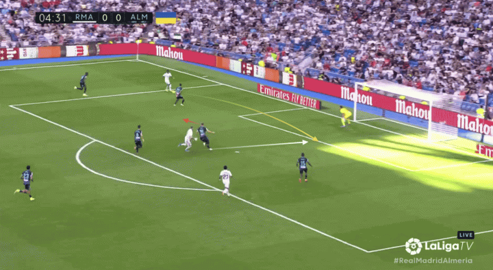 然后本澤馬突然改變行進方向,從埃利身后奔向小禁區,維尼修斯再過一人后輕松給本澤馬獻上助攻。