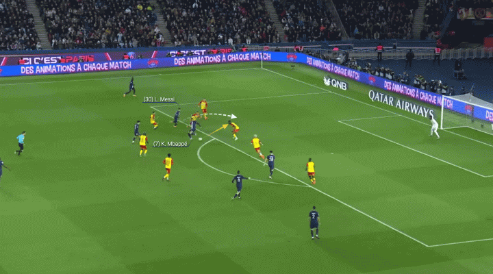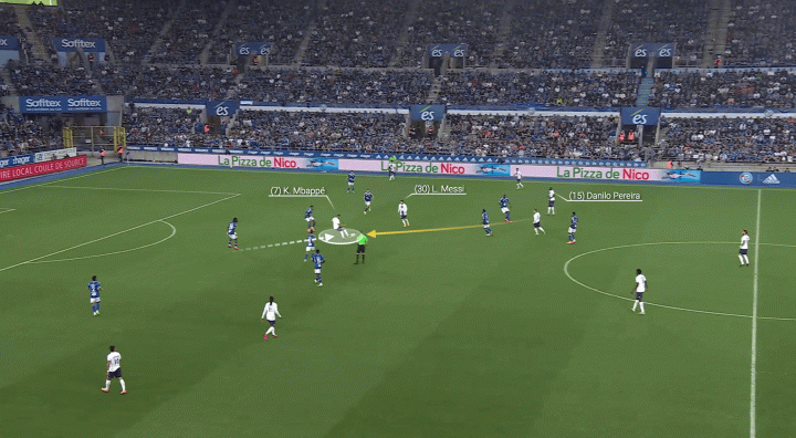 姆巴佩來到中場,接到佩雷拉的傳球,然后將球回敲給梅西。