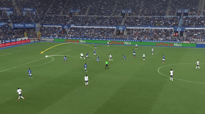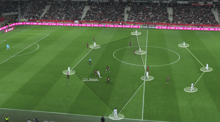 姆巴佩是一名喜歡傳球,喜歡快速二過一擺脫防守壓力的球員,在巴黎他經常發現自己孤木難支。他和進攻搭檔的距離偏遠,而且因為巴黎圣日耳曼的中場回收很深——如下圖對陣尼斯的比賽,姆巴佩在進攻端沒有更多的選擇。