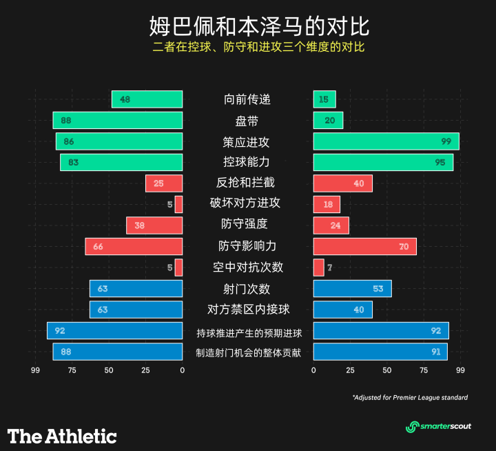說到二人之間最大的差別,在于姆巴佩的向前傳遞和盤帶比本澤馬多得多。