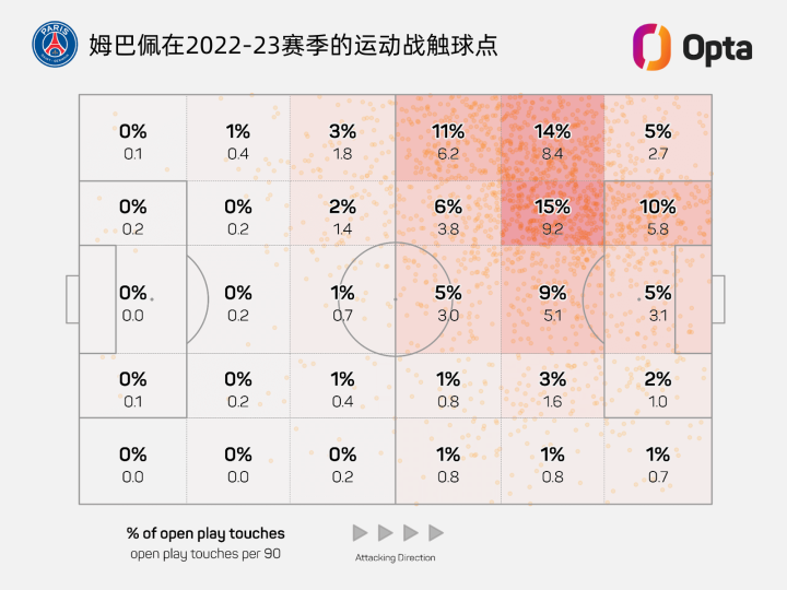 但通過兩人上賽季的觸球點可以看到,姆巴佩和維尼修斯還是很不一樣的,前者不像維尼修斯那樣時常抱緊邊路,倒是與本澤馬的活動區域高度類似。