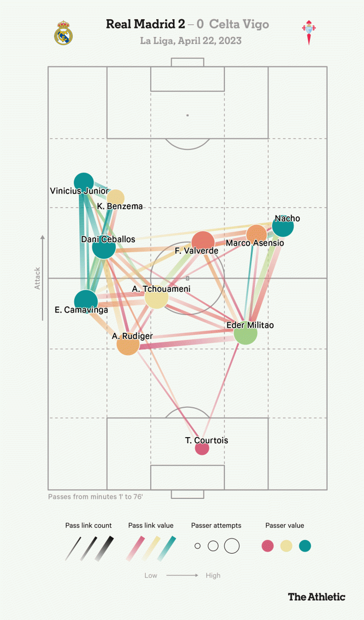 在這場比賽中,本澤馬共有5次射門,維尼修斯嘗試了15次過人,并貢獻3次關鍵傳球,但一球一助的右翼球員阿森西奧拿走了全場最佳——因為塞爾塔全部的防守精力都集中在了本方的右路。