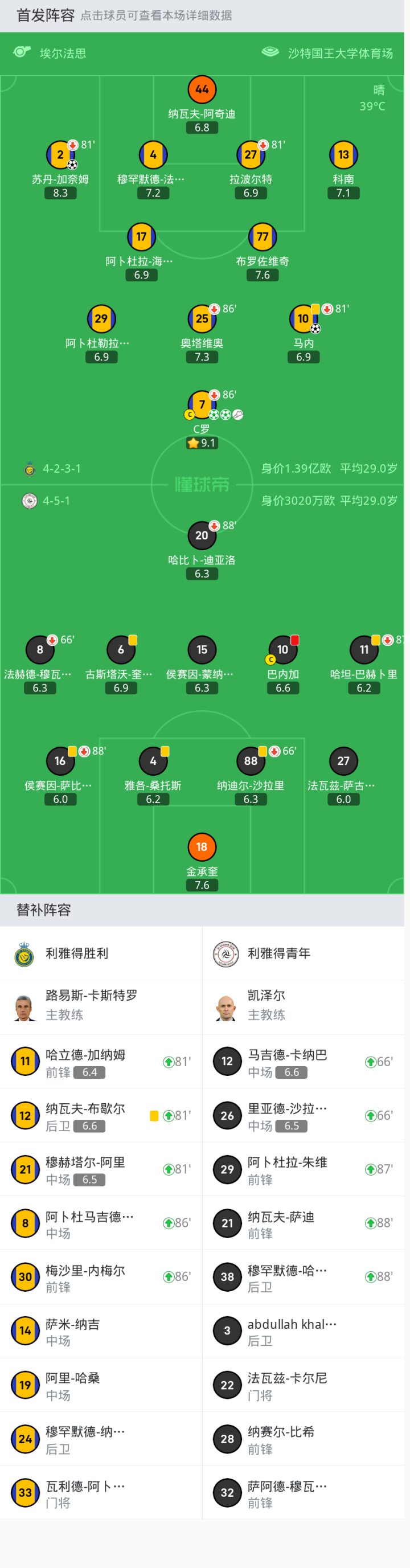 利雅得勝利首發:C羅, 布羅佐維奇, 拉波爾特, 穆罕默德-法蒂勒, 馬內, 奧塔維奧, 蘇丹-加奈姆, 科南, 阿卜杜拉-海巴里, 阿卜杜勒拉赫曼-加里卜, 納瓦夫-阿奇迪