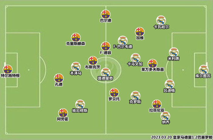 首發陣容中有四名中場,防線身前沒有標準的防守型后腰,三名老將的體能問題令人擔心……安切洛蒂擺出的首發陣容強在控球,不適宜長時間“無球”,如何設計防守站位非??简炛鲙浀闹腔?。為了不影響反擊時的“彈出”,F-巴爾韋德盡量避免長時間呆在右后衛位置,努力保持四后衛站位,維尼修斯也很注意退守,這樣就可以減輕莫德里奇的消耗。