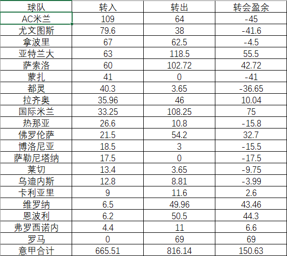 截止8.11日意甲的意甲轉會金額(以官宣為準),單位百萬歐元: